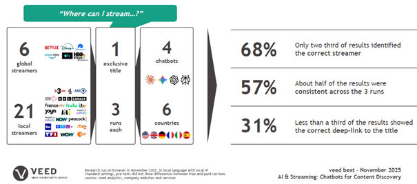 Cílem studie AI & Streaming: Chatbots for Content Discovery bylo zjistit, jak dobře dokáže dnešní generativní AI uživatelům pomoci s hledáním streamovaného obsahu. Autoři studie zkoumali, jestli chatboti dokážou správně identifikovat streamovací platformu, zda jsou schopni nabídnout konzistentní odpovědi a poskytnout přímý odkaz na konkrétní hledaný titul. Z výzkumu vyplývá, že navzdory skutečnosti, že jsou chatboti stále častěji integrováni přímo do operačních systémů a chytrých televizí, jejich schopnost skutečně podpořit vyhledatelnost obsahu je prozatím omezená. To platí zejména pro lokální evropské streamovací služby.