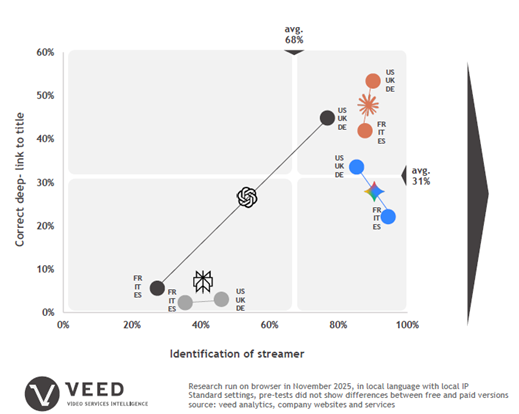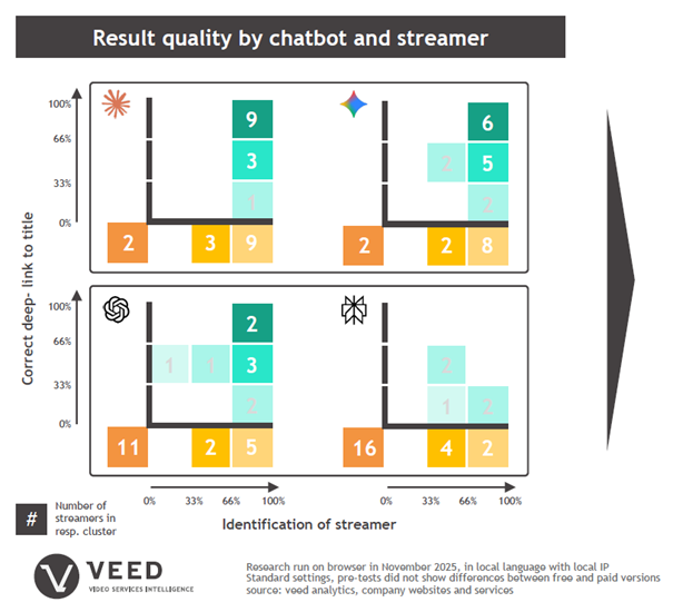 ChatGPT se pohybuje spíše u spodní hranice hodnocení. Schopnost identifikovat správnou streamovací službu je omezená a celkově nedosahuje ani poloviny úspěšnosti. Mírně lepší výsledky se vyskytly v regionech USA, Velké Británie a Německa. V oblasti přímých odkazů je výkon ChatGPT ještě slabší – správné přímé odkazy se v odpovědích vyskytují jen sporadicky. ChatGPT je podle studie vhodný spíše jako nástroj pro získání základní orientace. K tomu, aby byl efektivním prostředkem pro skutečné zjednodušení cesty k obsahu, má ještě hodně daleko.