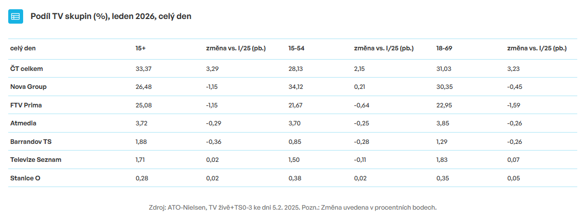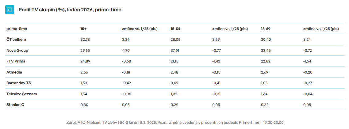 Stanice České televize zaznamenaly v lednu 2026 nejvyšší podíl ve sledovanosti na televizním trhu v divácké skupině starší 15 let v celodenním vysílání i v prime-time. Souhrnný podíl představoval 33,37 % a byl meziročně vyšší o více než tři procentní body. ČT dosáhla nejvyšší sledovanosti i v divácké skupině 18-69 v rámci celého dne. Vyplývá to z oficiálních dat měření televizní sledovanosti ATO-Nielsen.