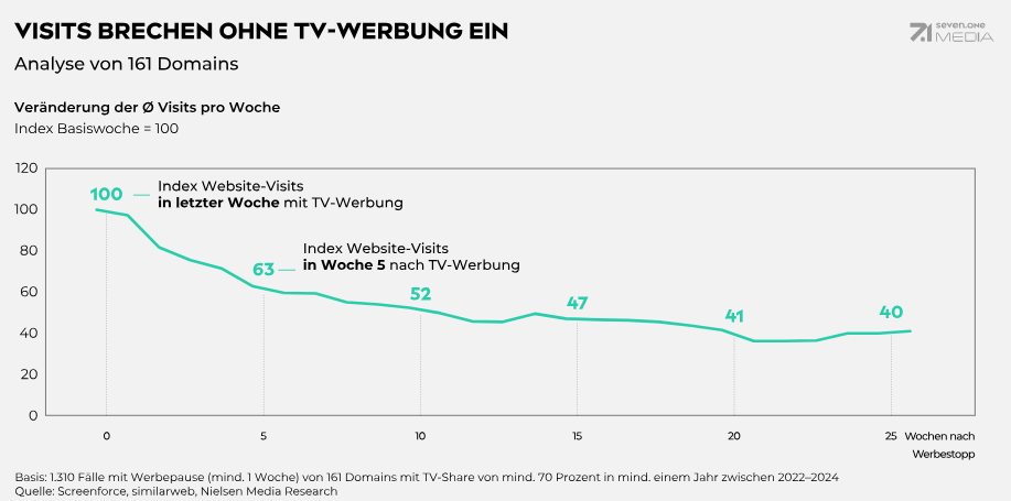 Co tento poznatek znamená pro poskytovatele webových stránek, však zatím není příliš bráno v potaz. O to zajímavější jsou výsledky nové studie Screenforce „From TV-Screen to Action“. Vědci zkoumali vliv televizní reklamy na návštěvnost webů. Výsledky shrnuje Johanna Teichmann, vedoucí oddělení Advertising & Consumer Research v Seven.One Entertainment Group: „Zaznamenali jsme silný nárůst v průběhu reklamních kampaní v televizi a po nich.“ V průměru se návštěvnost zkoumaných webových stránek během televizních reklamních kampaní zvýšila o 14 % procent a dokonce ještě čtyři týdny po jejich skončení byla v průměru o 6 % vyšší než na začátku. Studie také ukazuje, jaký vliv na návštěvnost má pozastavení televizní reklamy. Již po pěti týdnech pauzy klesl počet návštěv v průměru o 40 %. „Televize působí na obou stranách trychtýře, má vliv na budování značky i na aktivizaci osob, které jsou právě na trhu,“ vysvětluje výzkumnice v oblasti reklamního účinku.