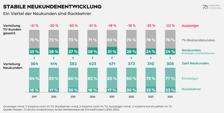 To by mohl být jeden z důvodů, proč se v posledních letech zvýšil počet firem, které se vrátily k televizní reklamě, a to nezávisle na celkových investicích. V současné době asi čtvrtina nových zákazníků, kteří sáhli po reklamě na velké obrazovce, inzerovala v televizi již dříve, ale před svým návratem si dala alespoň dvouletou pauzu. V roce 2017 činil podíl firem, které se vrátily, mezi novými zákazníky ještě 16 procent. Analýza Seven.One také ukazuje, že celkový počet nových zákazníků (začínajících a vracejících se) je za posledních osm let relativně stabilní. Přibližně čtvrtinu tvoří nováčci, zhruba 20 % odejde a tři čtvrtiny zůstávají tomuto médiu věrné.