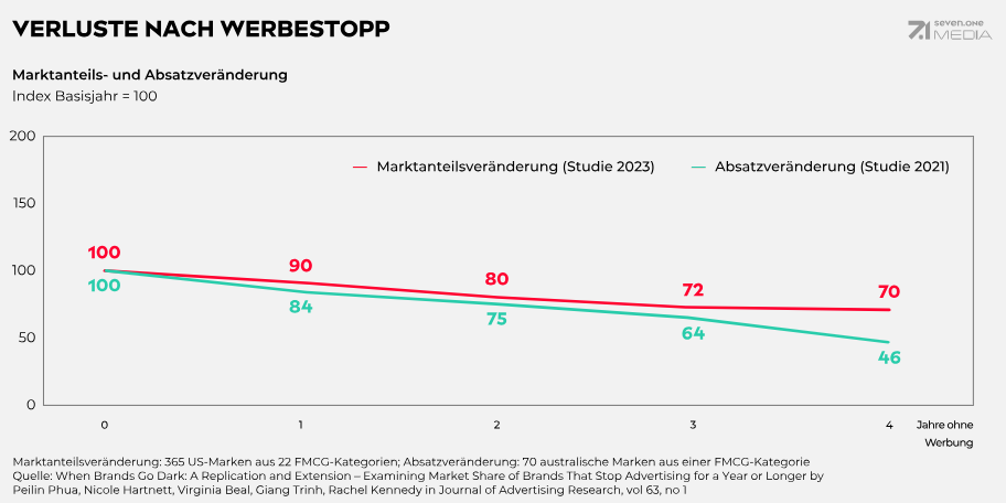 Vedoucí úlohu zde hraje australský Ehrenberg-Bass Institute, který se již řadu let intenzivně zabývá souvislostí mezi investicemi do médií a mentální dostupností značek. Ve dvou studiích z let 2021 a 2023, které zahrnovaly celkem více než 400 značek z oblasti rychloobrátkového zboží, Australané ukázali, jak důležité je pro úspěch podniku pravidelné osvěžování paměťových struktur spotřebitelů prostřednictvím reklamy. Po zastavení reklamních kampaní klesaly rok po roce tržby i podíly na trhu; vzpomínka na značky v myslích spotřebitelů postupně bledla.