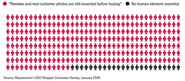 Alex Kirk, ředitel výzkumu ve společnosti Bazaarvoice, k tomu uvedl: „Výsledky našeho nejnovějšího průzkumu GEO Shopping Consumer Survey ukazují, že pravidla objevování produktů se změnila – umělá inteligence se stala prostředníkem mezi značkami a spotřebiteli. Přesto však 9 z 10 zákazníků potřebuje před nákupem potvrzení od skutečných lidí. Autentické lidské hlasy tak zůstávají nepostradatelným základem nákupní zkušenosti. Pokud chtějí být značky objeveny, musí považovat obsah generovaný uživateli za klíčový vstup pro modely umělé inteligence, nikoli jen za obsahovou vrstvu na svém webu.“
