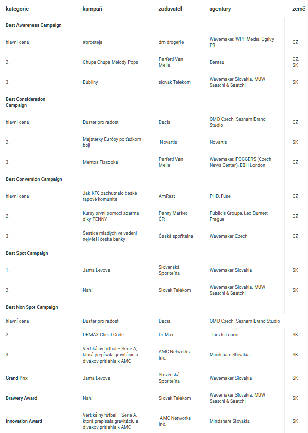 Hned dvě hlavní ceny ve vypisovaných kategoriích vybojovala OMD Czech a Seznam Brand Studio za kampaň pro Dacii Duster. Hlavní ceny získaly také dm drogerie a Wavemaker a Ogilvy PR za #prosteja. Vítězství si připsalo také KFC s agenturami PHD a Fuse za proniknutí do české rapové komunity.