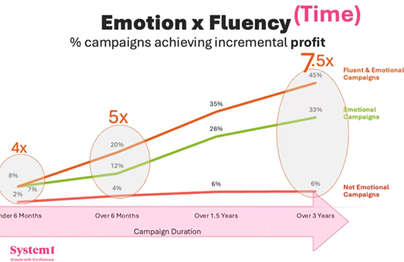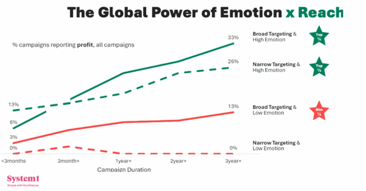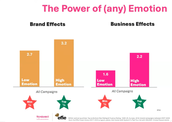 Podle Ritsona jsou emoce „největší pákou efektivity, kterou máme v rukou“. Reklamy, které vyvolávají silnou emocionální reakci – ať už pozitivní, či negativní – častěji vedou k růstu značky a lepším obchodním výsledkům. „Je potřeba spotřebitele přimět, aby něco cítil. Cokoliv. Přimějme ho, aby cítil úzkost, hrdost nebo aby třeba na chvíli během reklamy cítil znechucení,“ řekl. Data System1 potvrzují, že nejhorší reklamou je ta, která je nudná a průměrná. Emoce totiž vytvářejí paměťové stopy a posilují asociace se značkou. Z dlouhodobého hlediska se nejvíce vyplácejí pozitivní emoce, které vytvářejí trvalý příznivý dojem a ovlivňují budoucí rozhodování spotřebitelů.