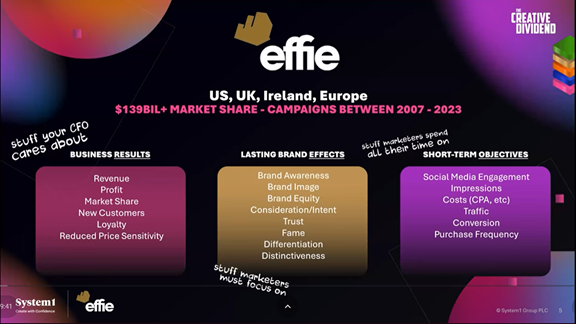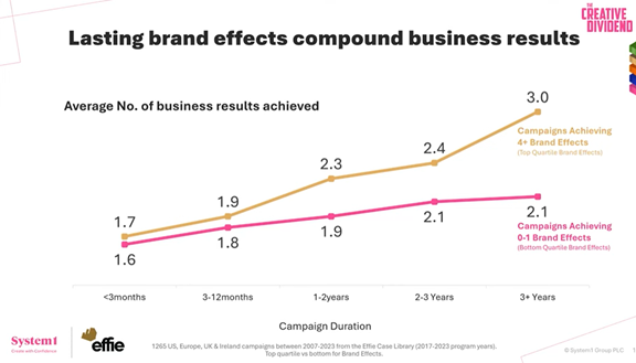 Zdroj: Webinář Creative Dividend 2025Nicméně, kampaně zaměřené na budování značky, tedy kampaně, které i v této éře efektivity dokážou vytvářet povědomí a podporovat důvěru, výrazný charakter, odlišení a jedinečnost značky, ve skutečnosti přinášejí mnohem větší efekt.
