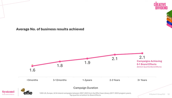 Třetí proměnnou je trvání kampaně. Reklamy, které zůstávají na trhu déle než tři roky, vykazují podle dat 7,5násobně vyšší účinek než ty, které běží jen pár měsíců. Ritson kritizuje marketéry, kteří nemají dost trpělivosti. „Oni prostě milují změny,“ řekl. „Ve většině firem začnou od okamžiku, kdy vytvoří svou reklamu, přemýšlet o tom, jak ji změní, jak ji překonají a co budou dělat dál,“ vysvětlil. Upozornil, že konzistence – stejné téma, stejné symboly, stejný příběh – přináší „složenou kreativitu“, která se sčítá v čase.