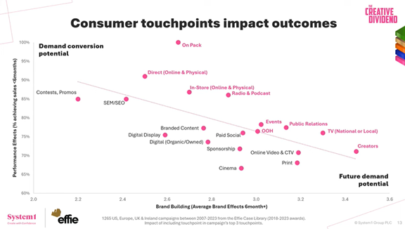 Zdroj: Webinář The Creative Dividend 2025K většímu efektu značek přispívají samozřejmě i různé touchpointy.