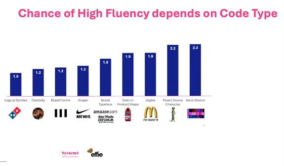 Silná emoce ale nestačí, pokud si divák nepamatuje, jaké značky se reklama týkala. Zde vstupuje do hry pojem fluency – schopnost značky být okamžitě rozpoznatelná díky vizuálním, zvukovým nebo jazykovým prvkům (brand codes). Různé kódy značky přitom mají různý vliv na rozpoznatelnost.