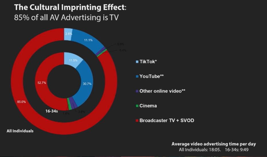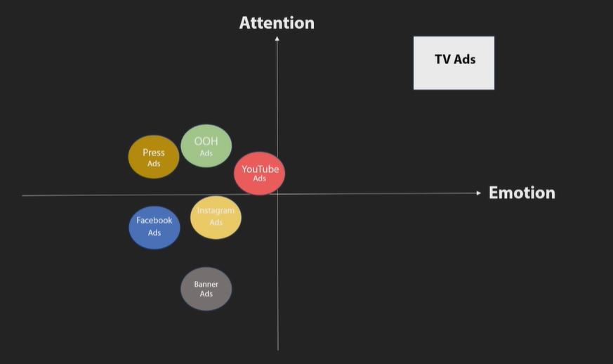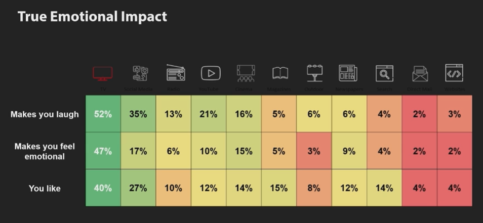 Zdroj: Webinář Vision 2025 – Mark RitsonPrůměrná doba sledování totiž, jak uvedl Ritson, přesahuje 20–25 minut, může dosahovat až tří hodin, s 71% aktivní pozorností. Zábava navíc funguje jako „přirozená imunita proti blokování reklam“. Televizní obrazovka nabízí „velké plátno“ s rozlišením 1920 x 1080 pixelů a prostorovým zvukem, které divákům umožňuje plně se ponořit do televizního zážitku a vyvolá 2,5x silnější emocionální reakci než mobilní zařízení a o 42 % vyšší míru zapamatování než online video. O emoce totiž jde v první řadě a důkazem je následující televizní reklama: