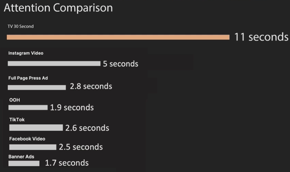 O pozornosti se v posledních pěti letech hodně mluví a jsou k dispozici působivá data. Ta ukazují, že televize v rámci 30sekundového spotu dosáhne průměrné pozornosti 11 sekund, což je více než dvojnásobek hodnoty zaznamenané u ostatních médií: