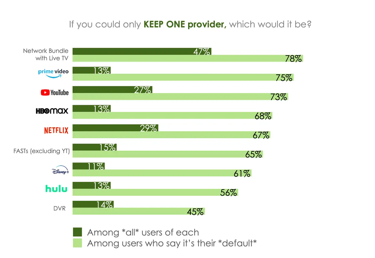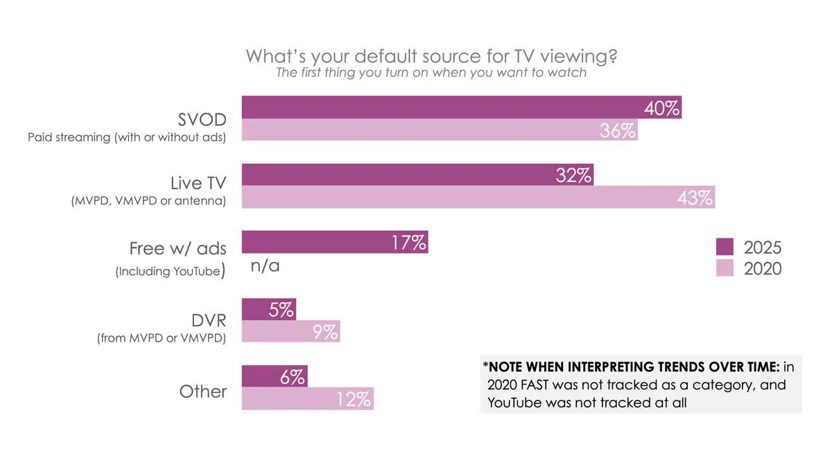 Z průzkumu vyplývá, že u 40 % diváků je „první věcí, kterou si zapnou“, služba SVOD. To je mnohem více, než 32 % diváků, kteří začínají sledováním živého vysílání od poskytovatele placené televize, živého streamování prostřednictvím virtuální MVPD služby nebo živého vysílání z klasické terestrické televize. Dalších 17 % začíná sledováním bezplatné streamovací služby (obvykle YouTube).