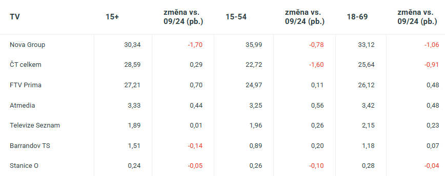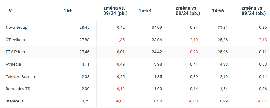 V září pokračoval růst Televize Seznam, která se v 15+ přehoupla přes 2 % a ve své primární skupině 18-69 si polepšila o 0,44 pb. na 2,19 %. A vyšší podíl mělo v září i zastupitelství tematických stanic Atmedia.