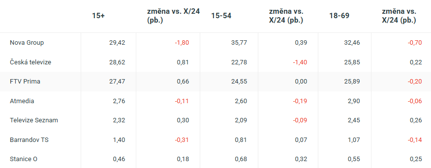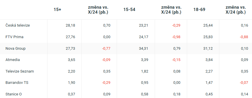 Televize Seznam continued its upward trend and the Óčko group also improved. The inclusion of the reality show Naked Attraction helped it to almost double in primetime (18-69).