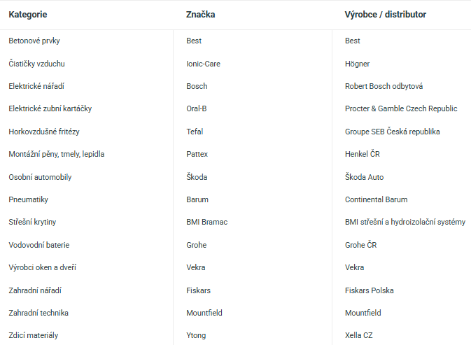 Among the newly awarded brands were XTB (brokerage companies), Oral-B (electric toothbrushes), Tefal (hot air fryers), Visa (credit cards) and Smartwings (airlines). Czech companies also performed well, such as Jablotron (home security), suit manufacturer Bandi and window and door manufacturer Vekra. The health care category had its winners, such as Neospan (sleep support) and Forfemina (weight management).