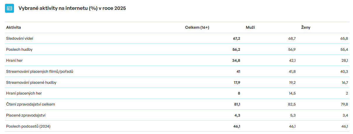 Watching videos remains the most popular form of online entertainment in the Czech Republic. However, its share has not increased over the past year, and the same applies to listening to music online. Conversely, the importance of gaming is growing, as is users’ willingness to pay for this type of entertainment. This is evident from data from the Czech Statistical Office (ČSÚ) for 2025 on the behaviour of the internet population aged 16 and over.