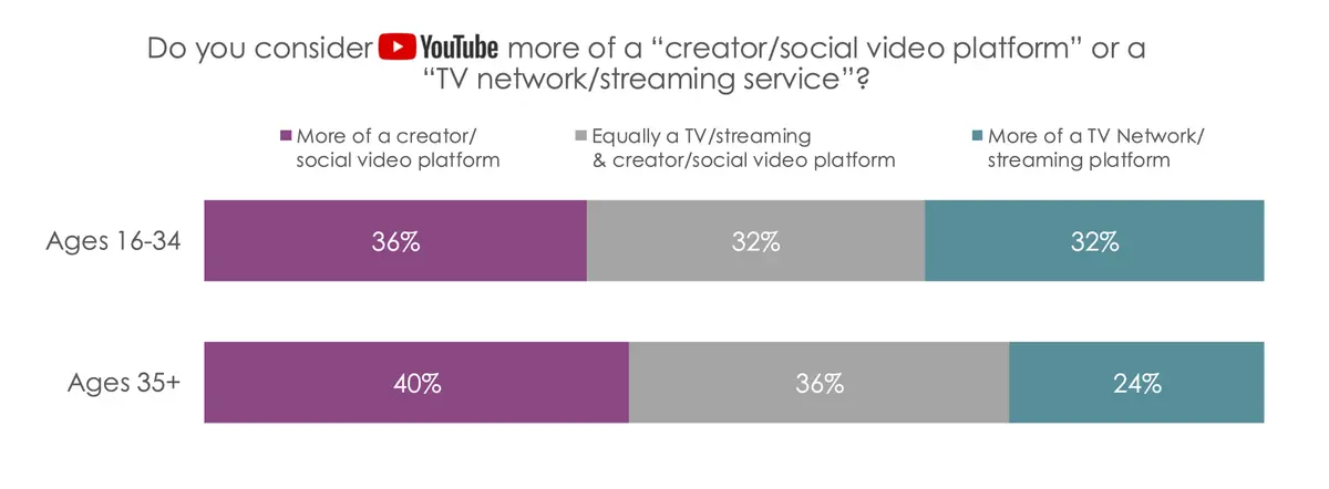 While many viewers still consider YouTube primarily a social/creator platform, a similar amount of people consider YouTube more of a "TV network/streaming service." Younger viewers are more likely (32%) to consider YouTube more of a "TV/streaming service" than older viewers age 35+ (24%).