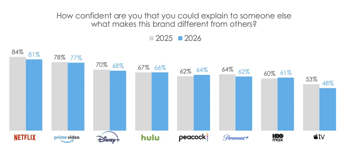 Since last year’s survey, the researchers reported there has been no movement on viewer's ability to confidently "explain what makes each brand different" from other brands—stalled at about two thirds of consumers for most top streaming brands.