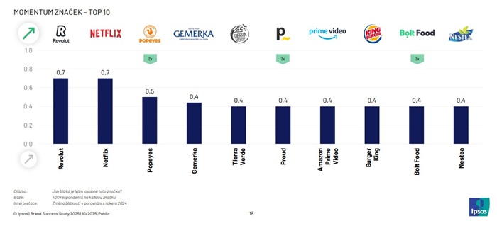 "Brand popularity among Czechs does not change much," said Michal Štěpánek from Ipsos. According to the survey, only six percent of brands have improved in the eyes of consumers year-on-year. The reasons for growth vary by category—for example, customer experience and online availability play a role in payment cards and courier services, while availability at points of sale plays a role in mineral water.