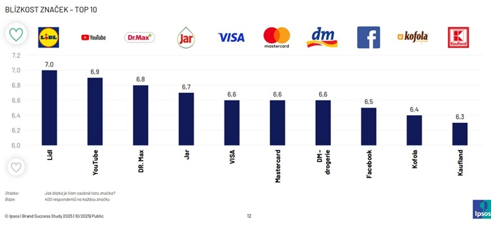 Czech consumers identify Lidl as their closest brand, followed by YouTube and the Dr. Max pharmacy chain, which is also the highest ranked purely Czech brand. This is according to an updated survey by Ipsos.