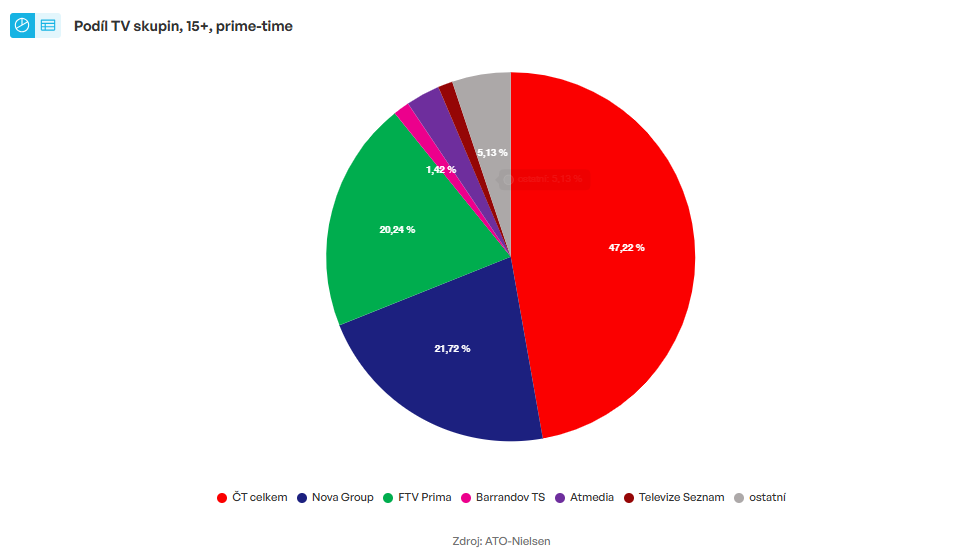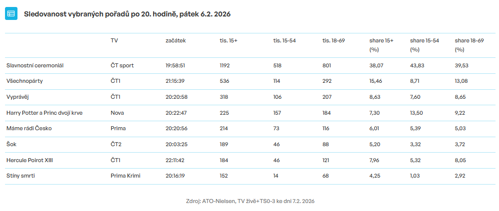 The live broadcast of the opening ceremony of the 2026 Winter Olympics was watched by 1.2 million viewers over the age of 15 and 1.25 million viewers over the age of 4 on the Czech Television sports channel. It was the best result of the evening and also of the entire Friday. ČT stations recorded less than half of the audience share during prime time. The total reach of the opening ceremony was 2.5 million viewers. This is the most-watched opening ceremony since the Winter Olympics in Sochi.