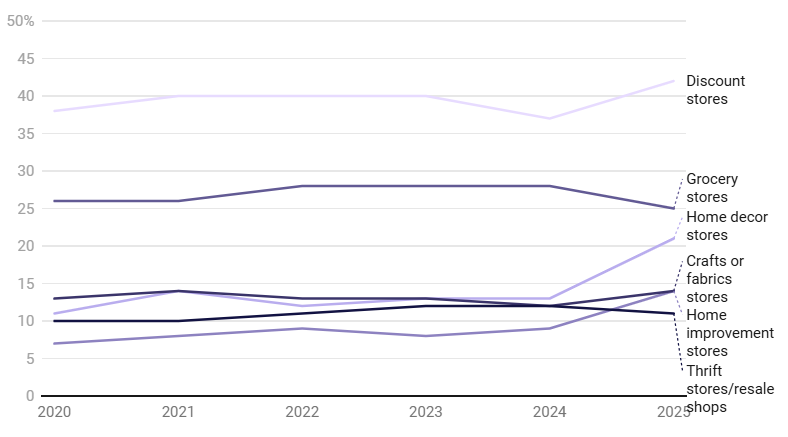 Craft and fabric stores are drawing in shoppers looking to engage in more DIY projects this season or make their own costumes, according to Cullen. The proportion of shoppers planning to buy at those stores is up to 14% this year, from 12% last year.
