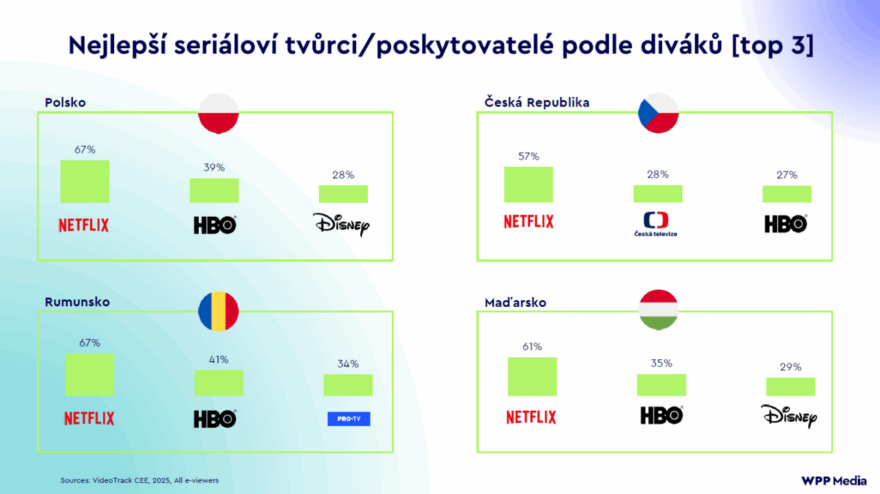 Netflix and HBO are considered the creators of the best series in all markets in the region. Disney is also in the top 3 in Poland, Pro TV in Romania and Czech Television in the Czech Republic. The Czech ranking of series creators is the most 'local' among the markets studied , with Nova and Prima completing the top 5.