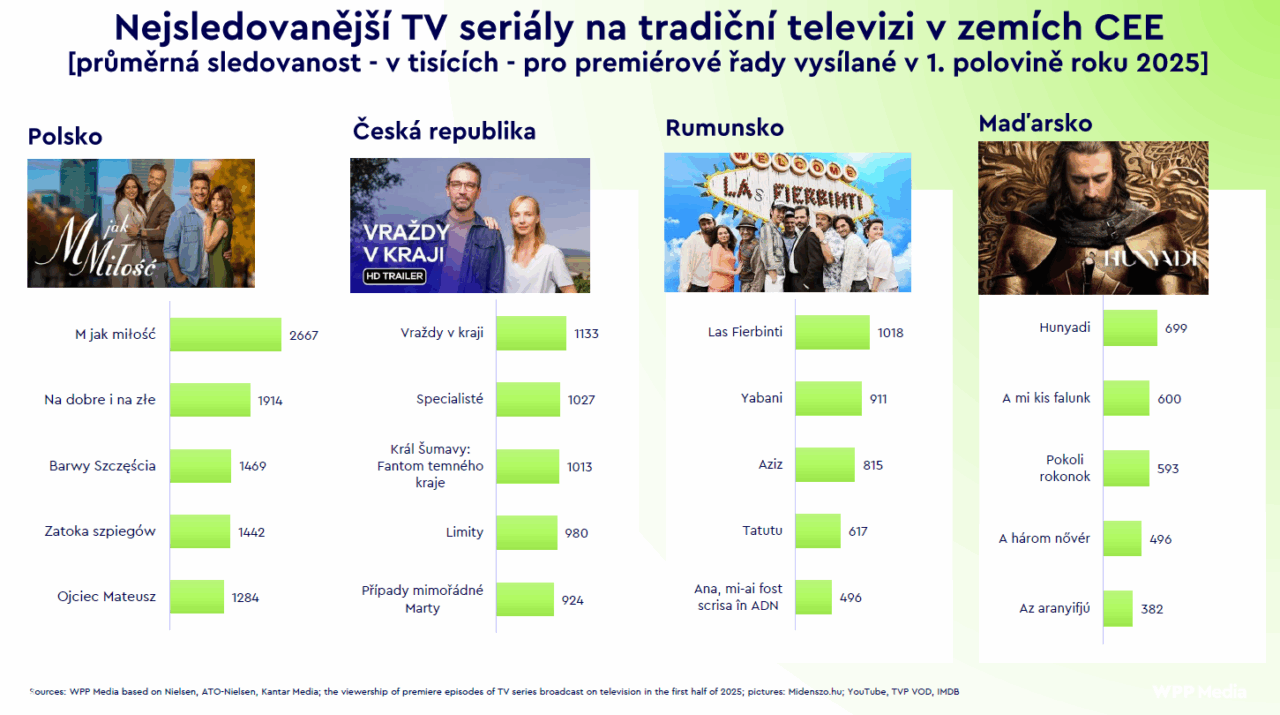 Despite the huge popularity of series on streaming, the genre remains key to traditional TV, where local hits dominated in the first half of 2025. Top series productions are still delivering double-digit viewership shares for broadcasters in the region. Most of the most popular TV series in the Czech Republic, Poland, Romania and Hungary are productions deeply rooted in local realities, often with a long history on the air (see Poland's "M jak miłość" with a 25-year history or "Las Fierbinti" from Romania, broadcast for 13 years).