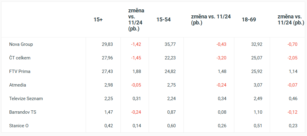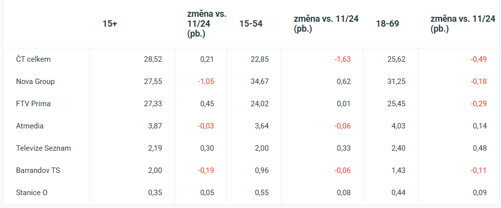The share of the main TV groups in full-time viewing in November 2025 developed differently year-on-year by audience target group. In the universal 15+ target group, Czech Television retained the largest share with 28.5%, a slight increase of 0.2 percentage points on the same month last year. Nova ( 27.6%) came in second place, closely followed by Prima (27.3%), which improved by 0.5 percentage points year-on-year. This is according to official ATO-Nielsen data.