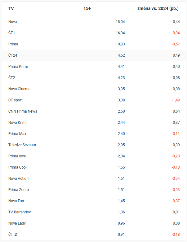 Of the individual stations, CNN Prima News had the highest year-over-year increase. Its share increased by 0.64 percentage points to 2.6% in audience group 15 . Interest in national news was reflected in the growth of news station ČT24, which increased its share by 0.49 percentage points to 4.62% in 2025. The third channel with the highest year-on-year growth was the main channel TV Nova. It improved by 0.4 percentage points to 18.03%. The top 5 highest growing channels are also Prima Krimi and Televize Seznam.
