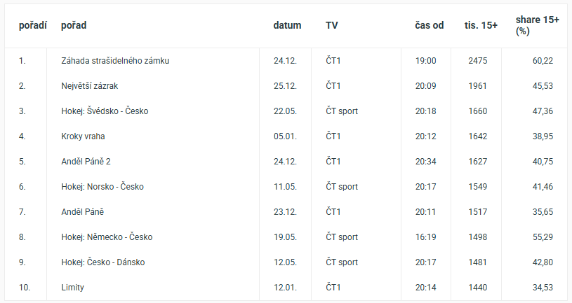 The most-watched programme of 2025 was the Christmas Eve fairy tale Záhada strašidelného zámku (ČT1), which was watched by 2.5 million viewers over 15 years of age. This was followed by the Christmas fairy tale The Greatest Miracle (ČT1) and the hockey match between the Czech national team and Sweden at the World Cup in May.