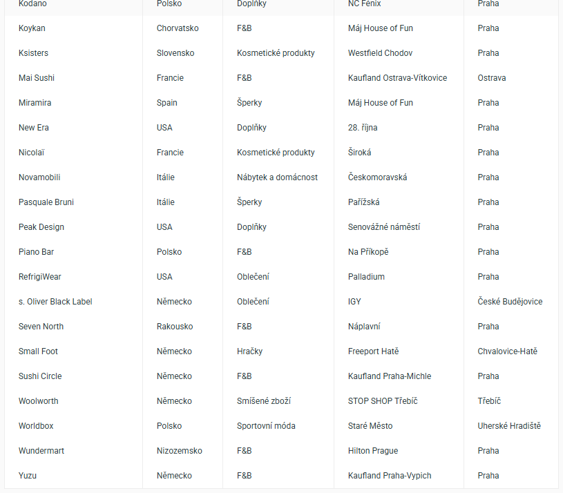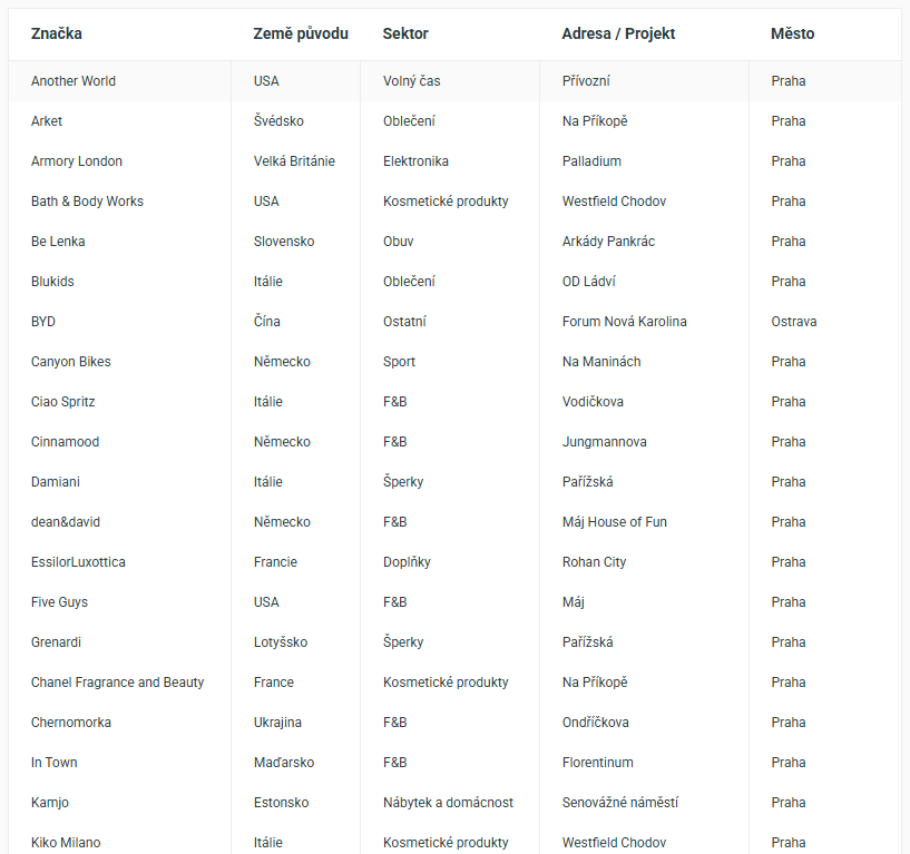 Na český trh v roce 2025 vstoupilo celkem 40 zahraničních značek, jak vyplývá z pravidelného průzkumu společnosti Cushman & Wakefield. Počet vstupů zůstává v posledních letech stabilní, kolem hranice 40 značek ročně. Výjimkou byl rekordní rok 2024 se 47 značkami. V roce 2025 přibylo pět nových brandů z luxusního segmentu, což představuje historicky nejvyšší počet. Nejvíce nových značek vloni přišlo z Německa (8), výrazné zastoupení měly také brandy z Itálie a USA (po 6).
