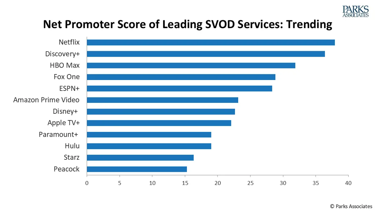 Průzkum také hodnotil nové skóre propagátorů různých streamovacích služeb. Skóre měří, jak pravděpodobné je , že předplatitelé doporučí (nebo propagují) službu někomu jinému, na stupnici od 1 do 100. Podle tohoto měřítka, které poskytuje hrubý odhad hodnoty, kterou spotřebitelé vnímají v dané službě, se na prvním místě umístil Netflix, následovaný Discovery, HBO Max, Fox One a ESPN. Peacock se umístil na posledním místě.